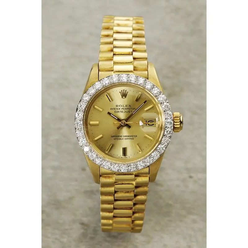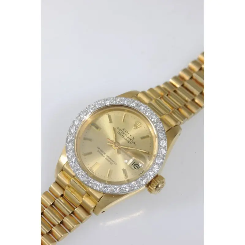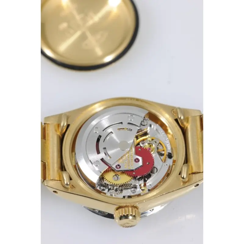 Geh.: 18Kt Gold, Schraubboden Ref. 6900, brillantbesetzte Lunette (nicht von Rolex), verschraubte "Twinlock"-Krone, 18Kt "President"-Goldarmband mit Faltschließe. Ziffbl.: vergoldet.